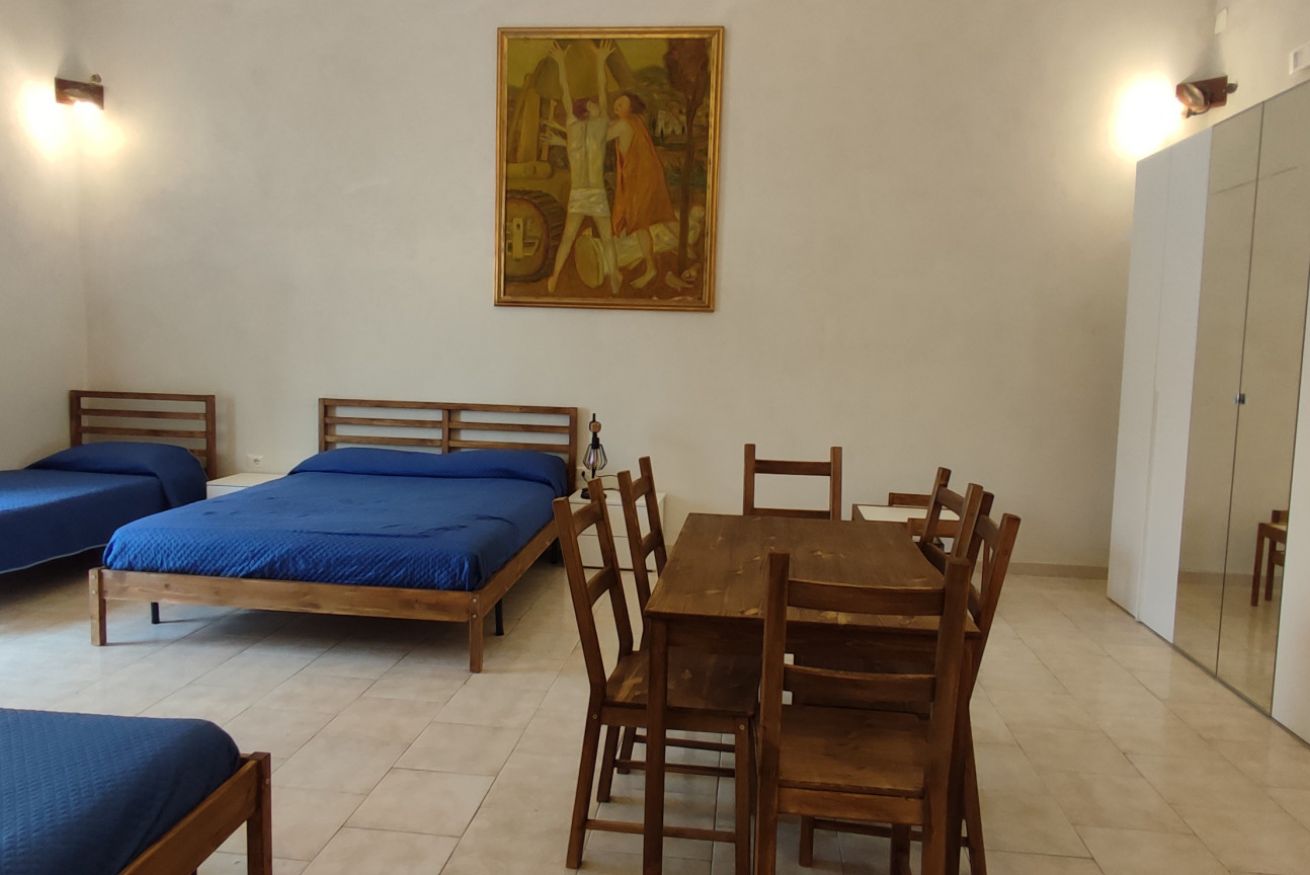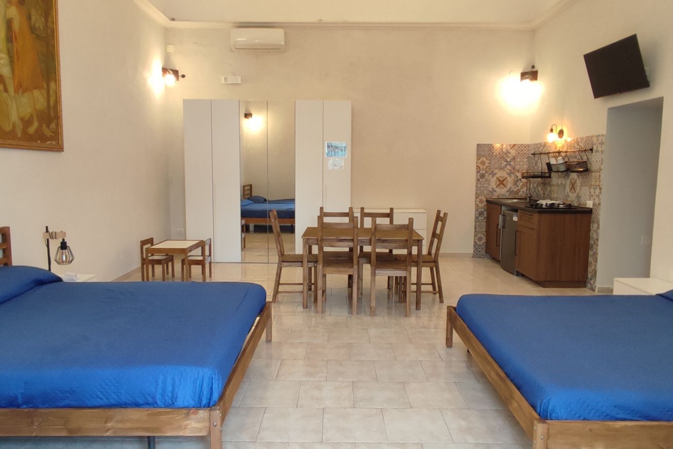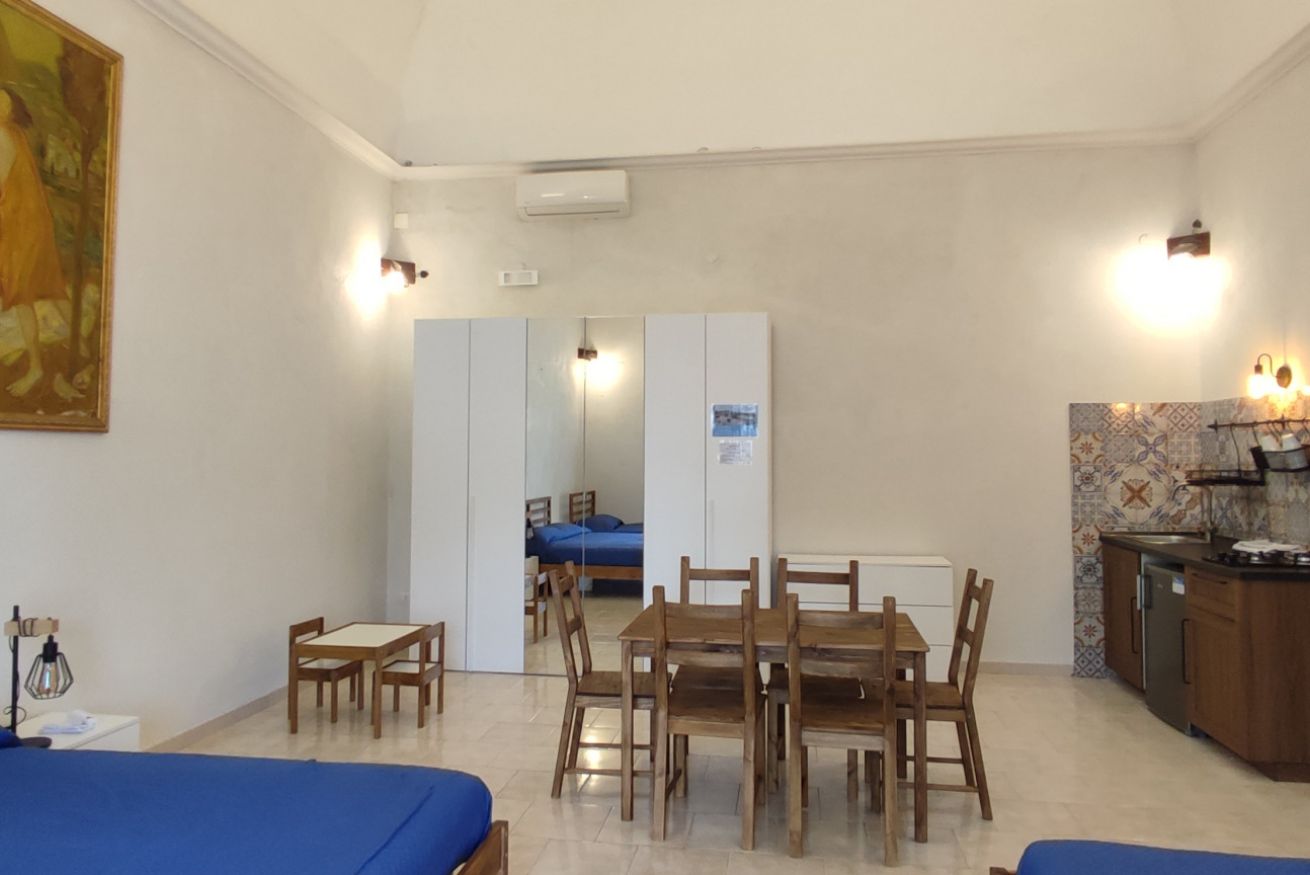 Sito al 1° piano dell'edificio principale, moderno e confortevole, il monolocale è ampio e luminoso. E' composto da 1 ampia camera con 2 letti matrimoniali e 2 letti singoli con angolo cucina + bagno privato.