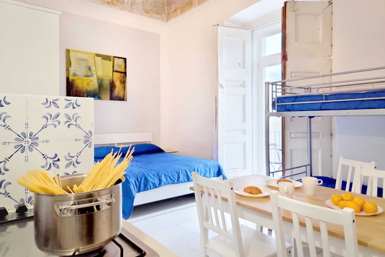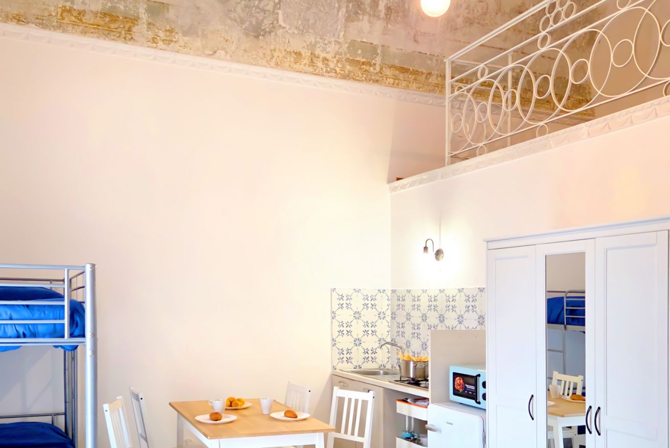 Sito al 1° piano, moderno e confortevole, il monolocale è composto da 1 ampia camera con letto matrimoniale, letto a castello e cucina + bagno privato esterno proprio fuori la porta.